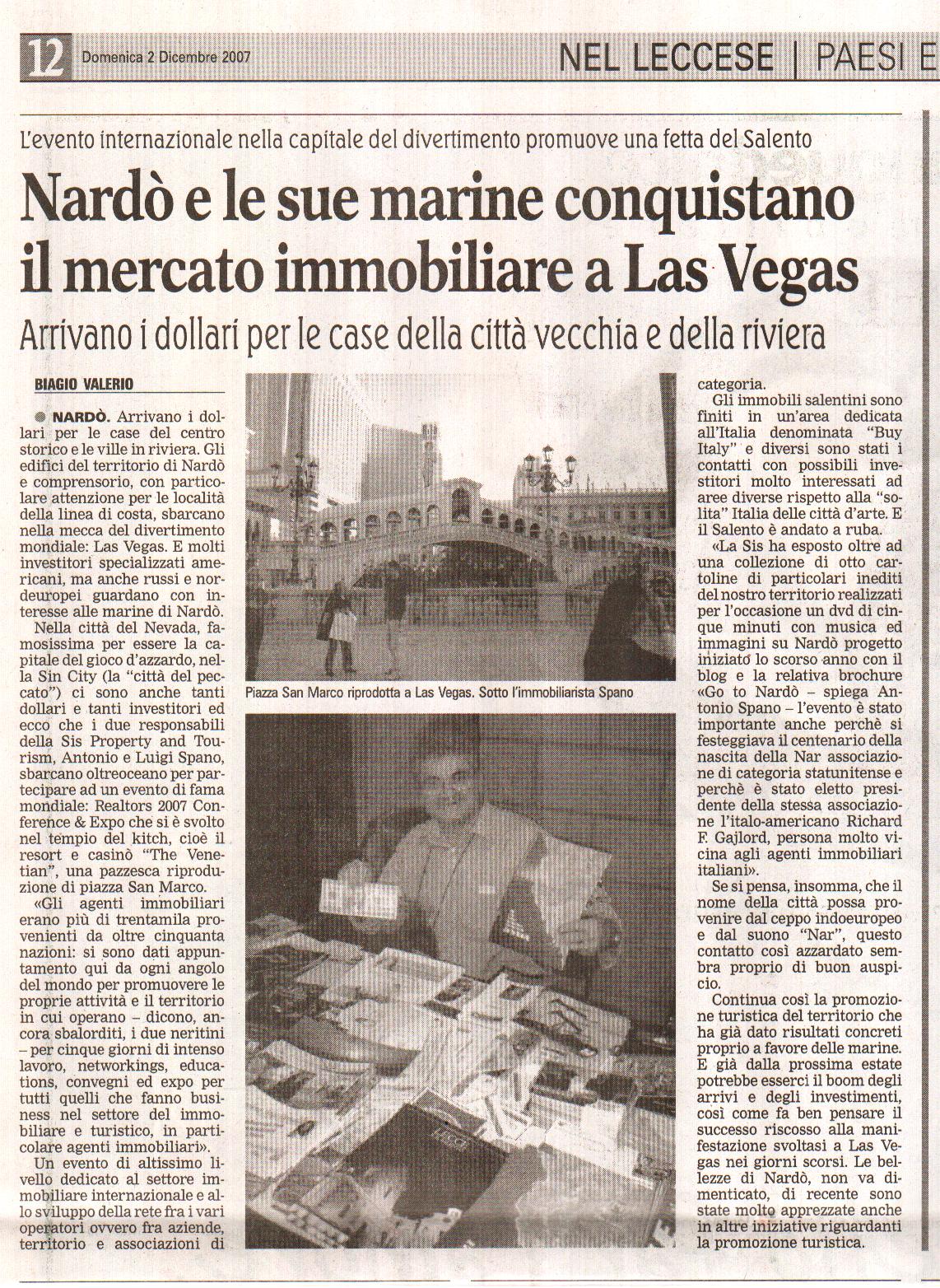 Qui di seguito l’articolo di Biagio Valerio sulla Gazzetta del Mezzogiorno del 2 Dicembre 2007, sulla partecipazione della nostra agenzia alla vetrina immobiliare più importante al mondo “Realtors 2007 Expo & Conference” tenutasi a Las Vegas NV USA dal 12 al 16 novembre 2007, ed alla quale Antonio e Luigi Spano hanno partecipato, intensificando così i rapporti con colleghi ed investitori internazionali interessati al mercato immobiliare della Puglia e del Salento.